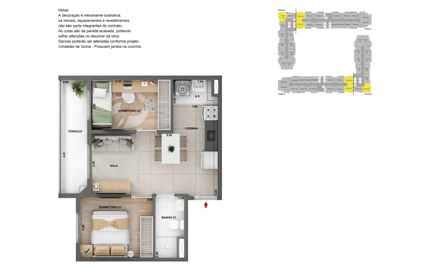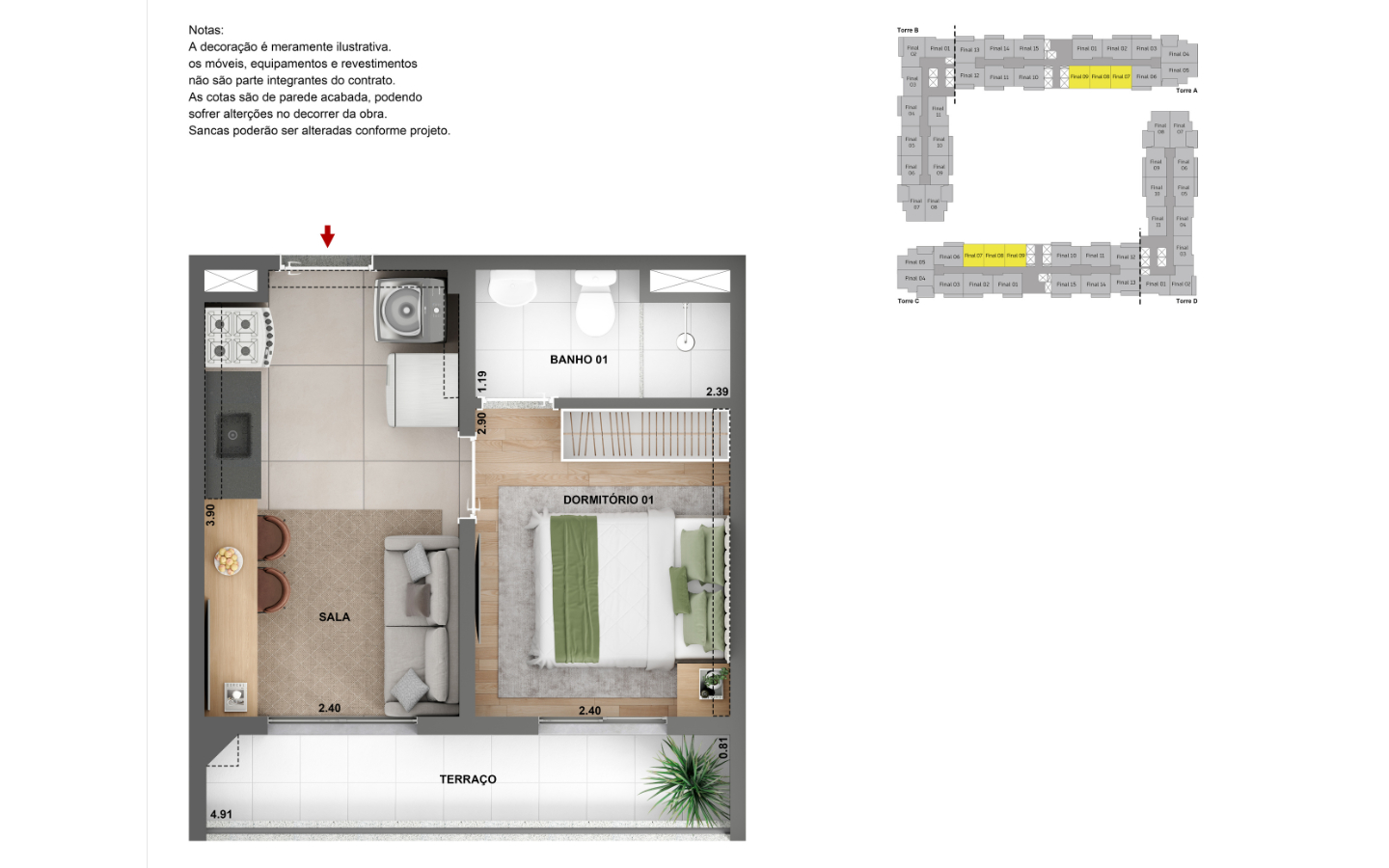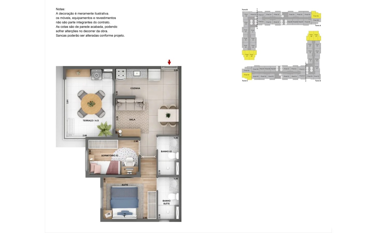 Apartamentos de 1 e 2 dorms, com opção de terraço e suíte.