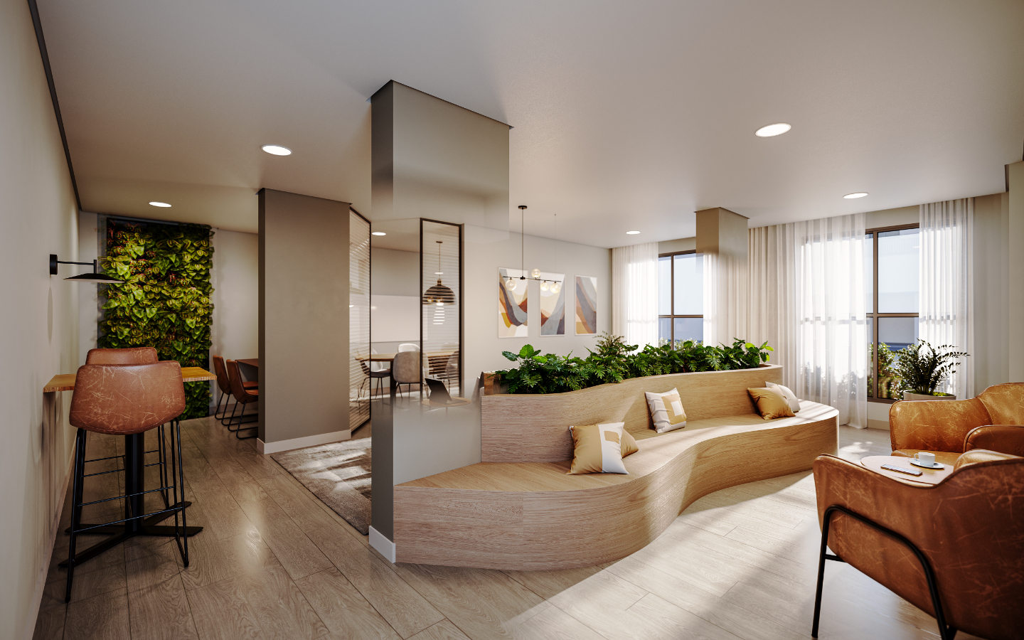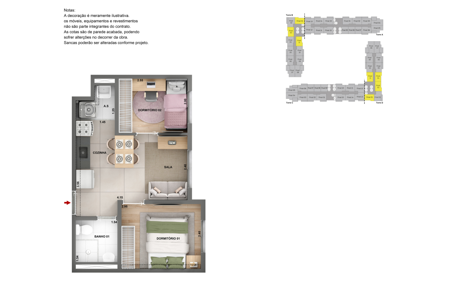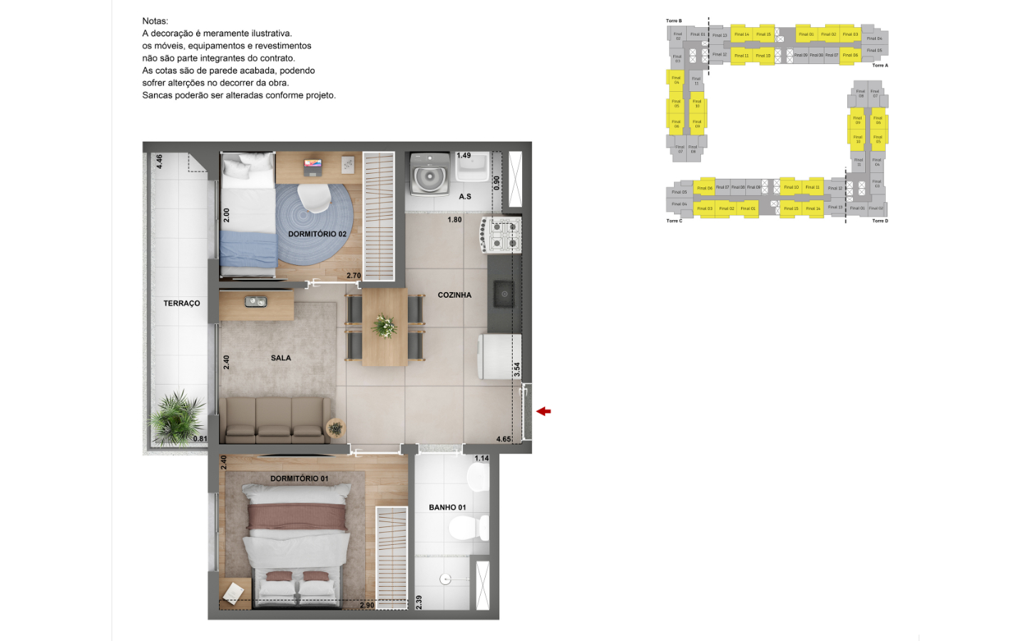 Apartamentos de 1 e 2 dorms, com opção de terraço e suíte.